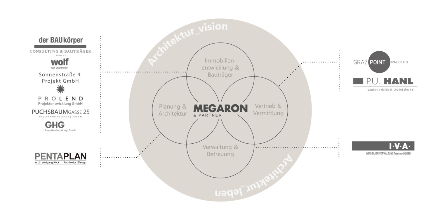 Das Megaron Partner-Netzwerk widmet sich allen Phasen im Lebenszyklus einer Immobilie. Von der ersten Analyse und Projektentwicklung, über die konkrete Umsetzung, bis hin zum langfristigen Betrieb bündeln wir die spezialisierte Kompetenz unserer Partner. Dies erlaubt die ganzheitliche Betrachtung der Immobilie, was Schnittstellenverluste eliminiert und so die zugesagte Qualität über den gesamten Lebenszyklus der Immobilie sichert.