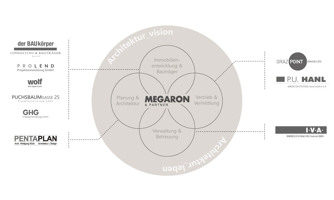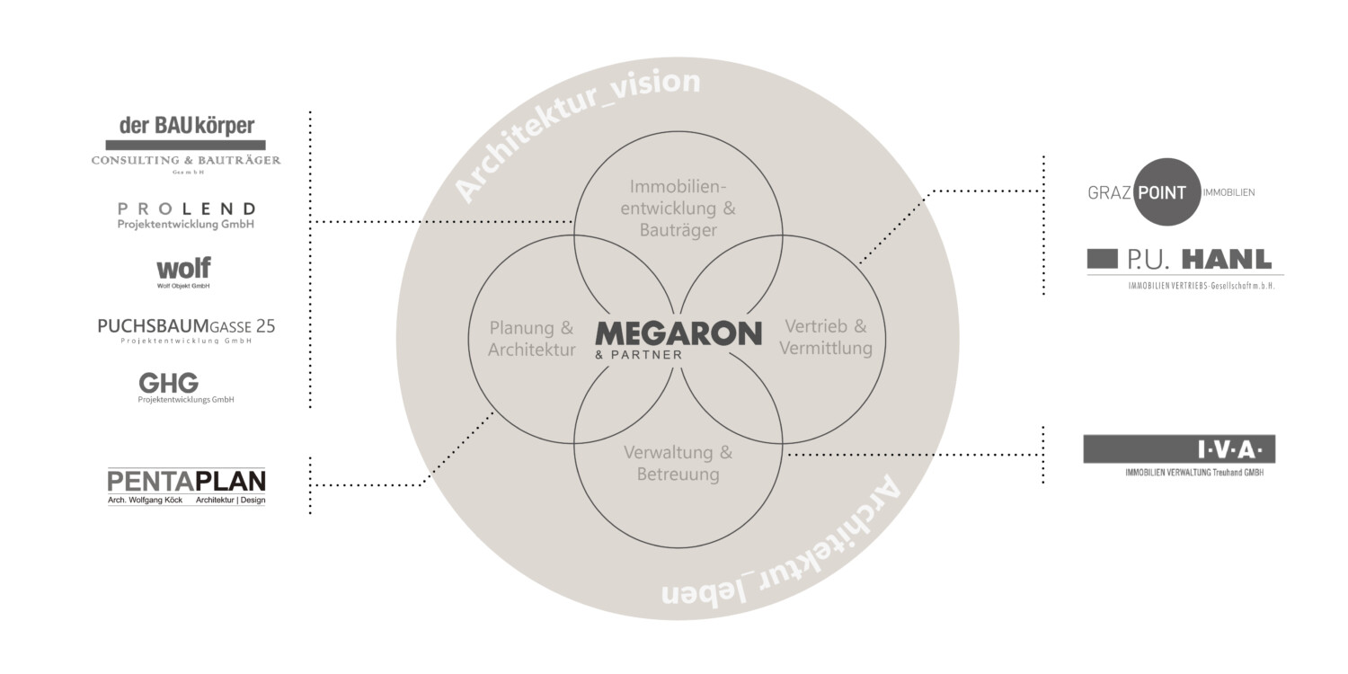 Das Megaron Partner-Netzwerk widmet sich allen Phasen im Lebenszyklus einer Immobilie. Von der ersten Analyse und Projektentwicklung, über die konkrete Umsetzung, bis hin zum langfristigen Betrieb bündeln wir die spezialisierte Kompetenz unserer Partner. Dies erlaubt die ganzheitliche Betrachtung der Immobilie, was Schnittstellenverluste minimiert und so die Qualität der Immobilie sichert.