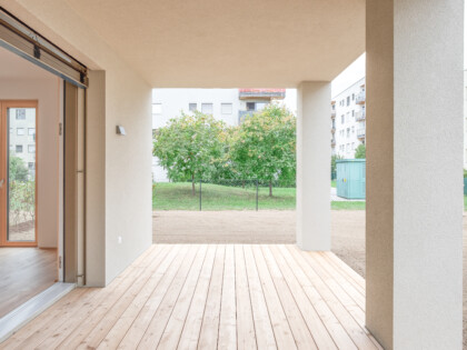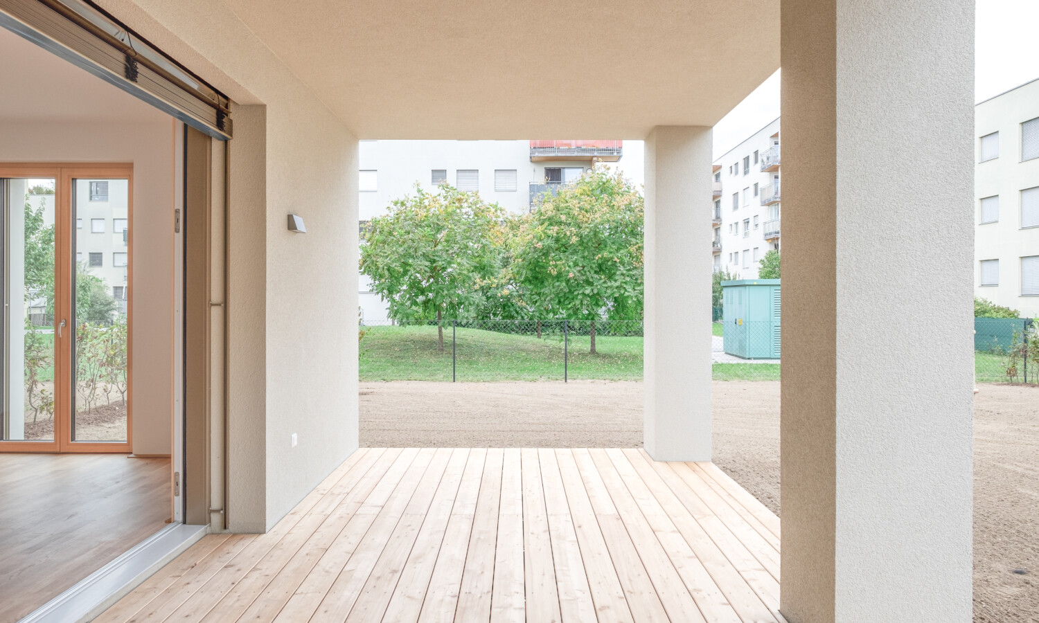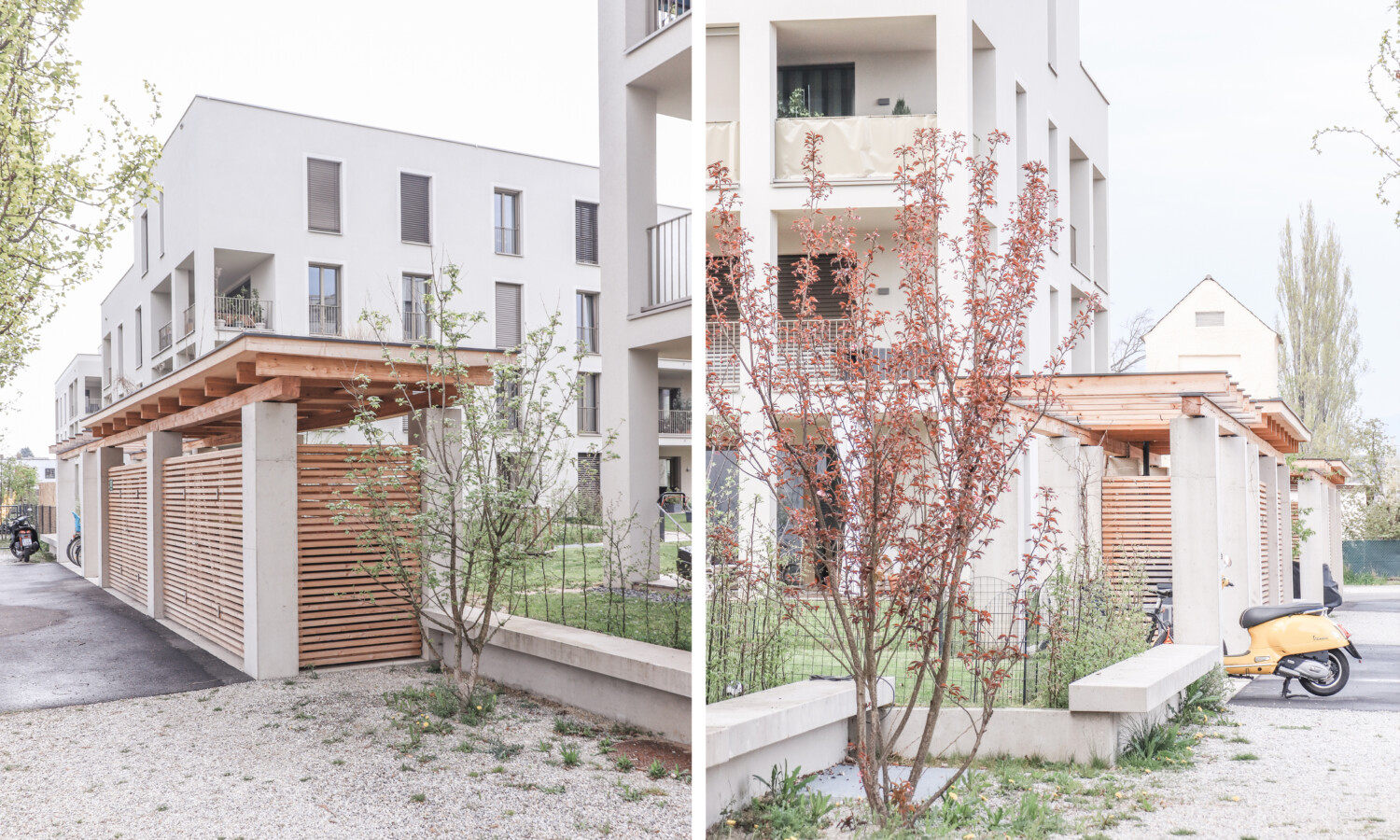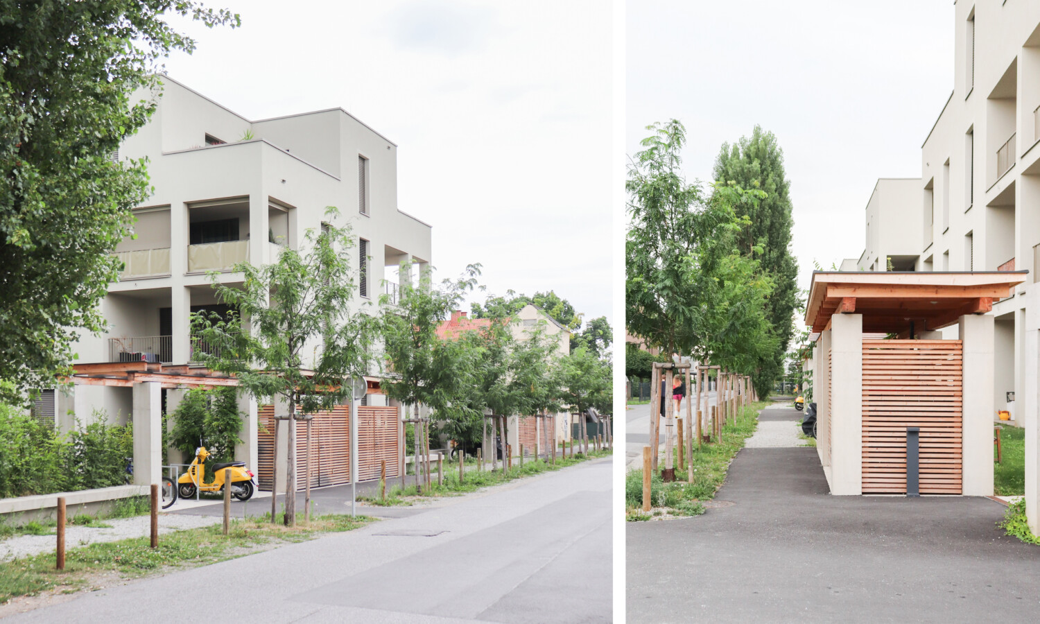 Eigengärten mit Obstbäumen und große überdachte Freibereiche bilden die besondere Qualität des Projekts. Ein begleitender Weg an der Baumallee im Osten lädt durch größere Vorzonen zum Verweilen ein.
