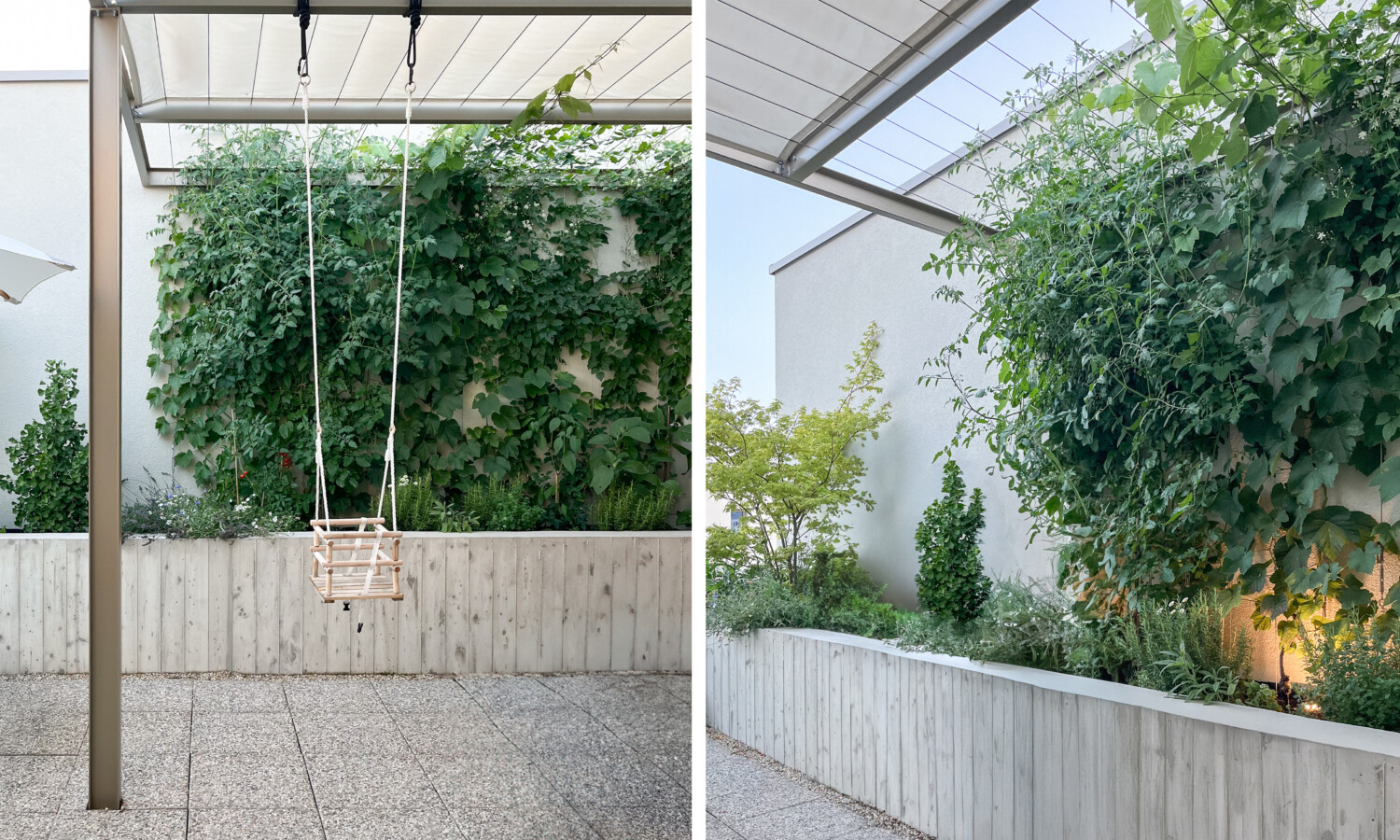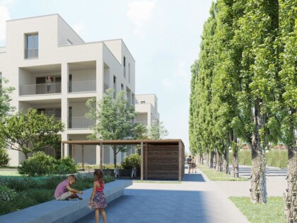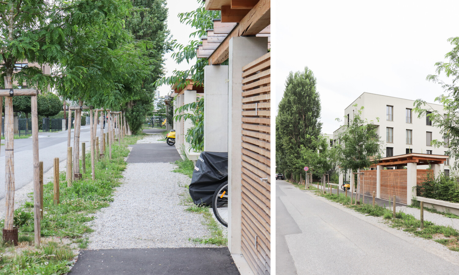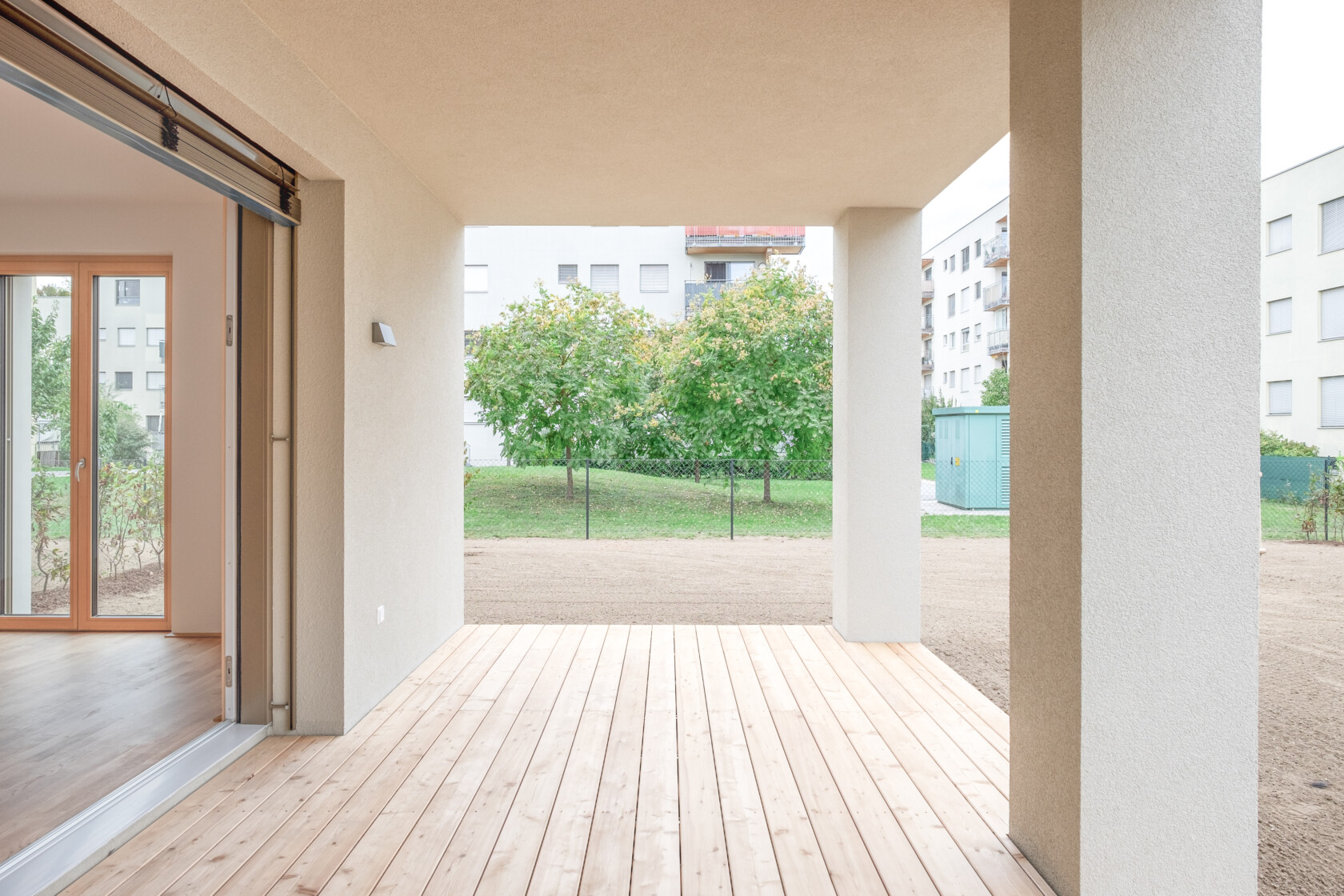 Eigengärten mit Obstbäumen und große überdachte Freibereiche bilden die besondere Qualität des Projekts. Ein begleitender Weg an der Baumallee im Osten lädt durch größere Vorzonen zum Verweilen ein.