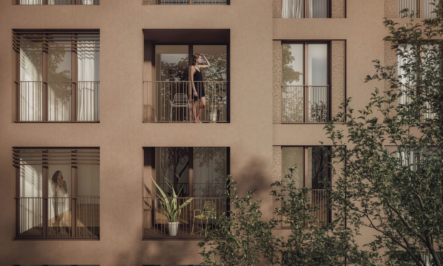 Jeder Lebensraum verfügt über einen eigenen Außenbereich: Straßenseitige Loggien mit urbanem Grünblick und hofseitige Balkone in den ruhigen Innenhof. Besonderes Augenmerk wurde bei den Freibereichen auf ein hohes Maß an Privatheit gelegt.