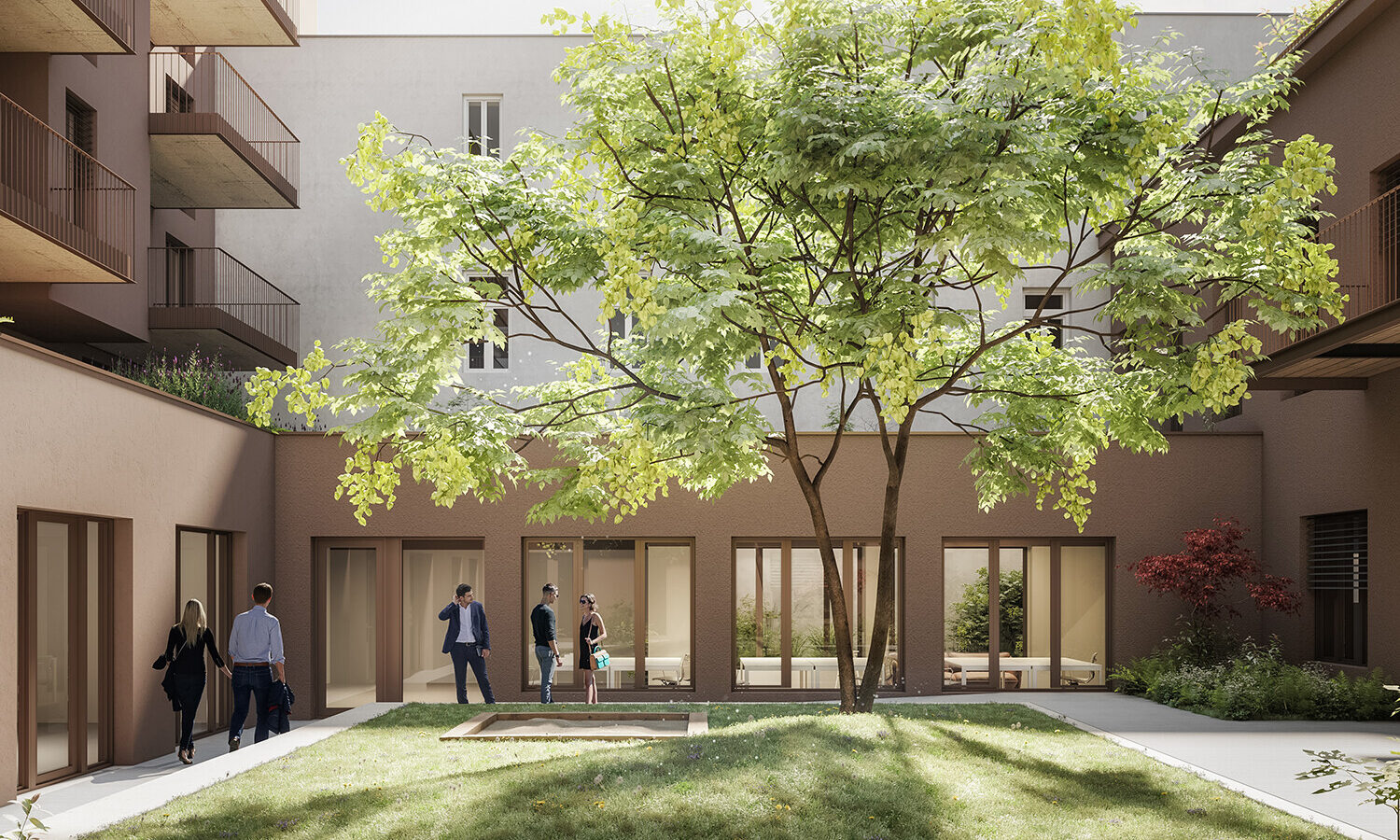 Der rechteckige Innenhof, der über einen Durchgang durch das Haupthaus direkt von der Puchsbaumgasse aus erreichbar ist, stellt Karls Herzstück dar. Mit Pflanzenbeeten entlang der Hoffassaden, begrünten Dachflächen und einem zentralen Baum entsteht hier ein Ort der Ruhe und Entschleunigung, in dem Natur und Architektur miteinander verschmelzen.