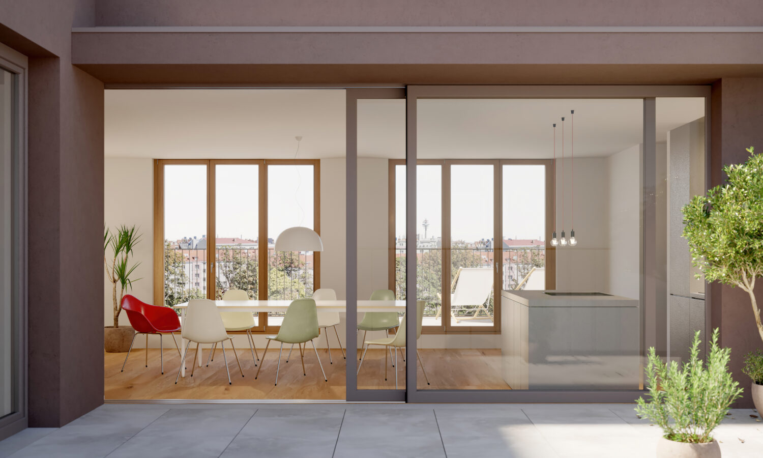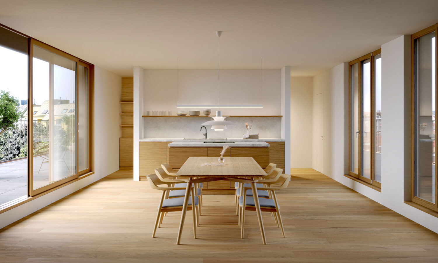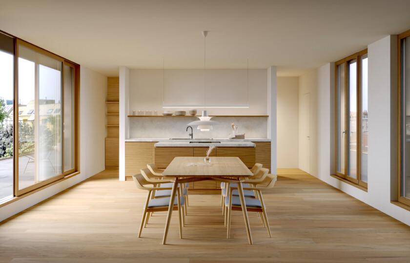 Die Wohnungen selbst sind großzügig über französische Fensterelemente in Holz-Aluminium und mit 3-fach-Verglasung belichtet. Eine hochwertige Ausstattung der Wohnungen, sowie deren Beheizung über eine Fußbodenheizung erzeugen ein großartiges Wohn-Ambiente.
