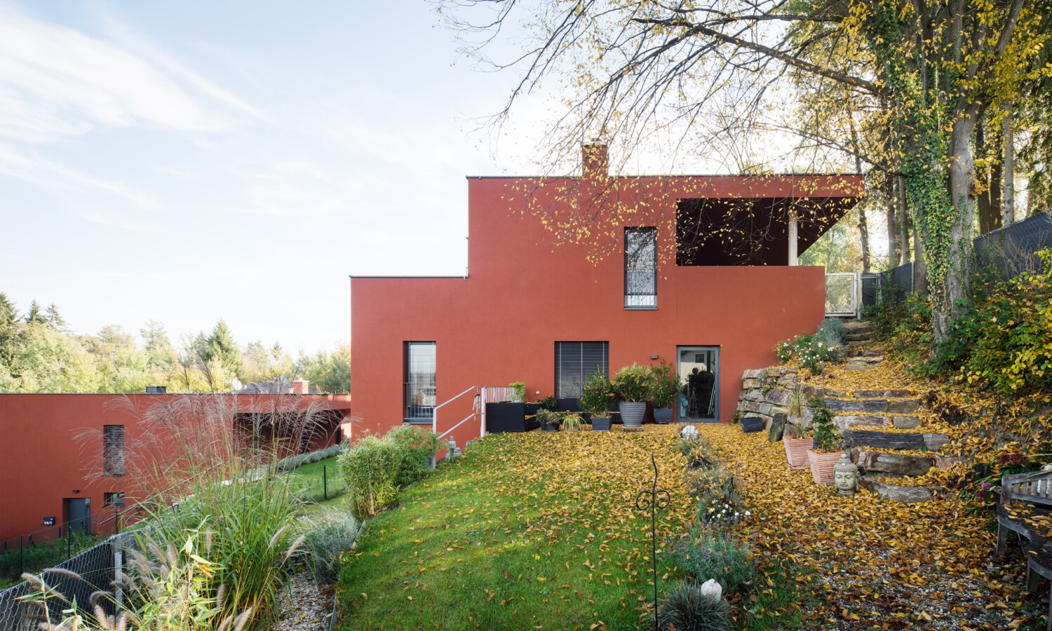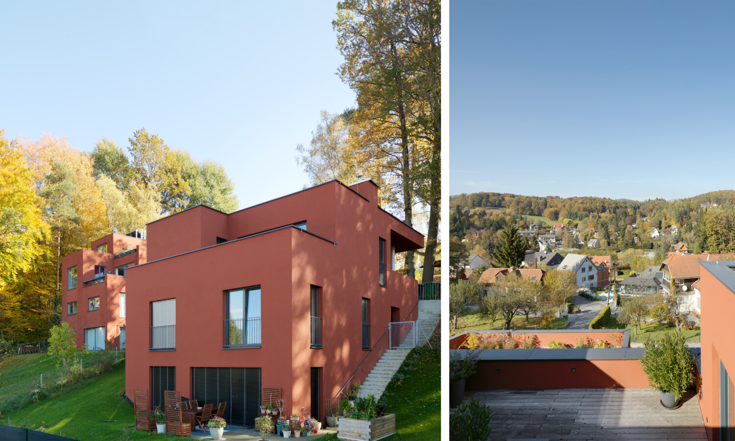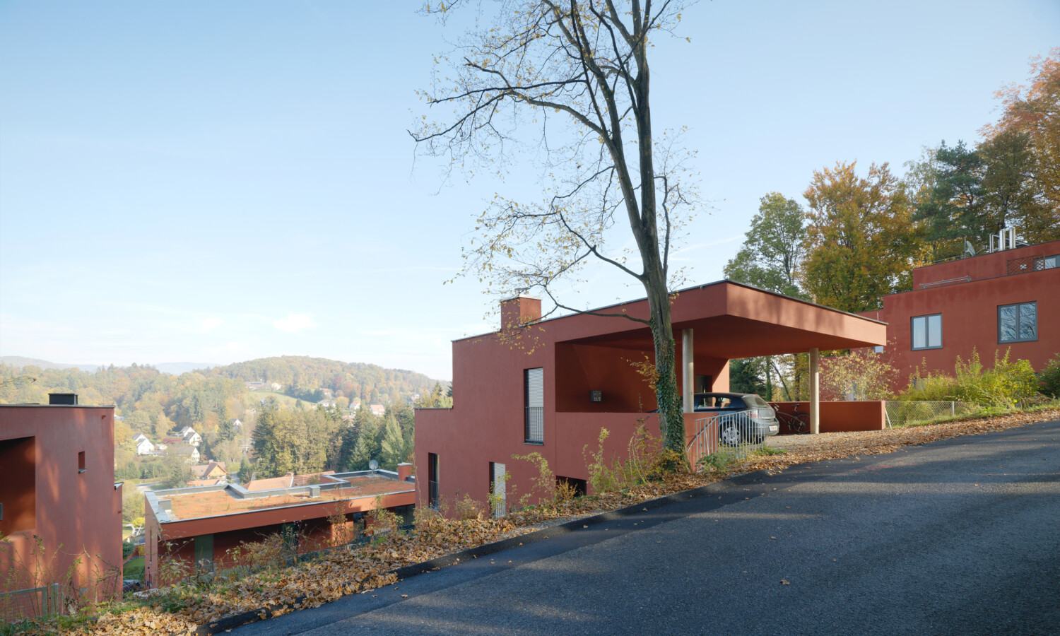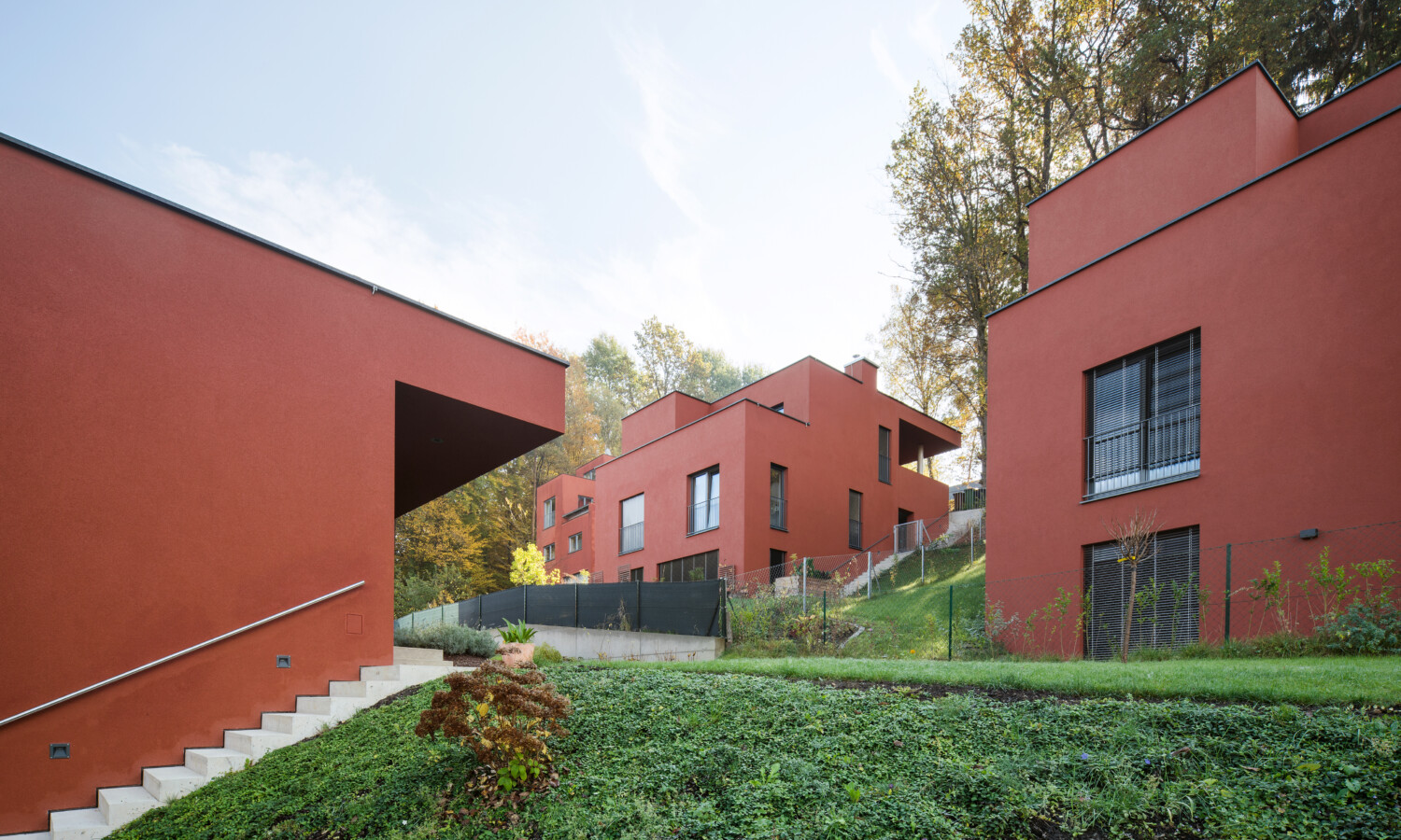 Ein großes Maß an Intimität ist eines der Kennzeichen des Projekts, ebenso wie die hohe Ausführungsqualität. Die Häuser öffnen sich zur Hauptblickrichtung Schöckl. Bei den Punkthäusern findet das Leben auf drei Etagen statt. Unter dem begrünten Dach sind Wohnzimmer, Küche und Terrasse untergebracht, die vom gedeckten Autoabstellplatz direkt erreicht werden können. Ein Stockwerk darunter liegen die Schlafzimmer, noch eine Etage tiefer gelangt man vom Studio in den Garten.