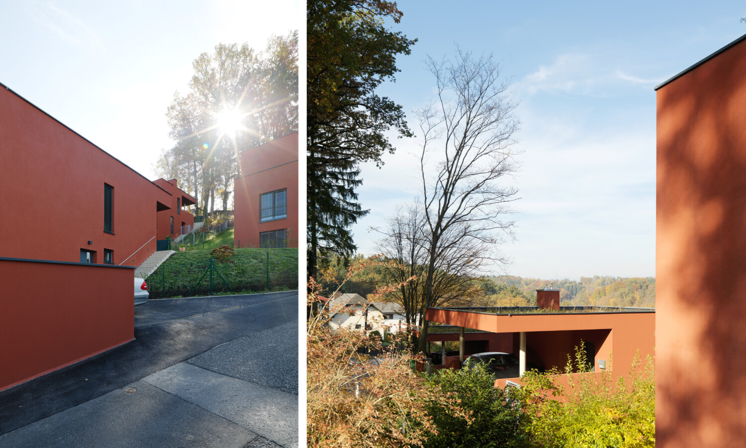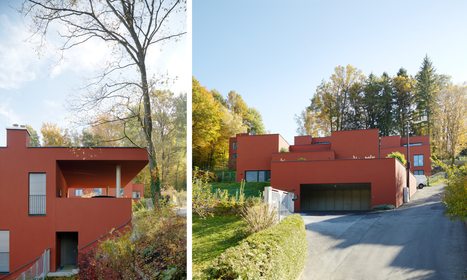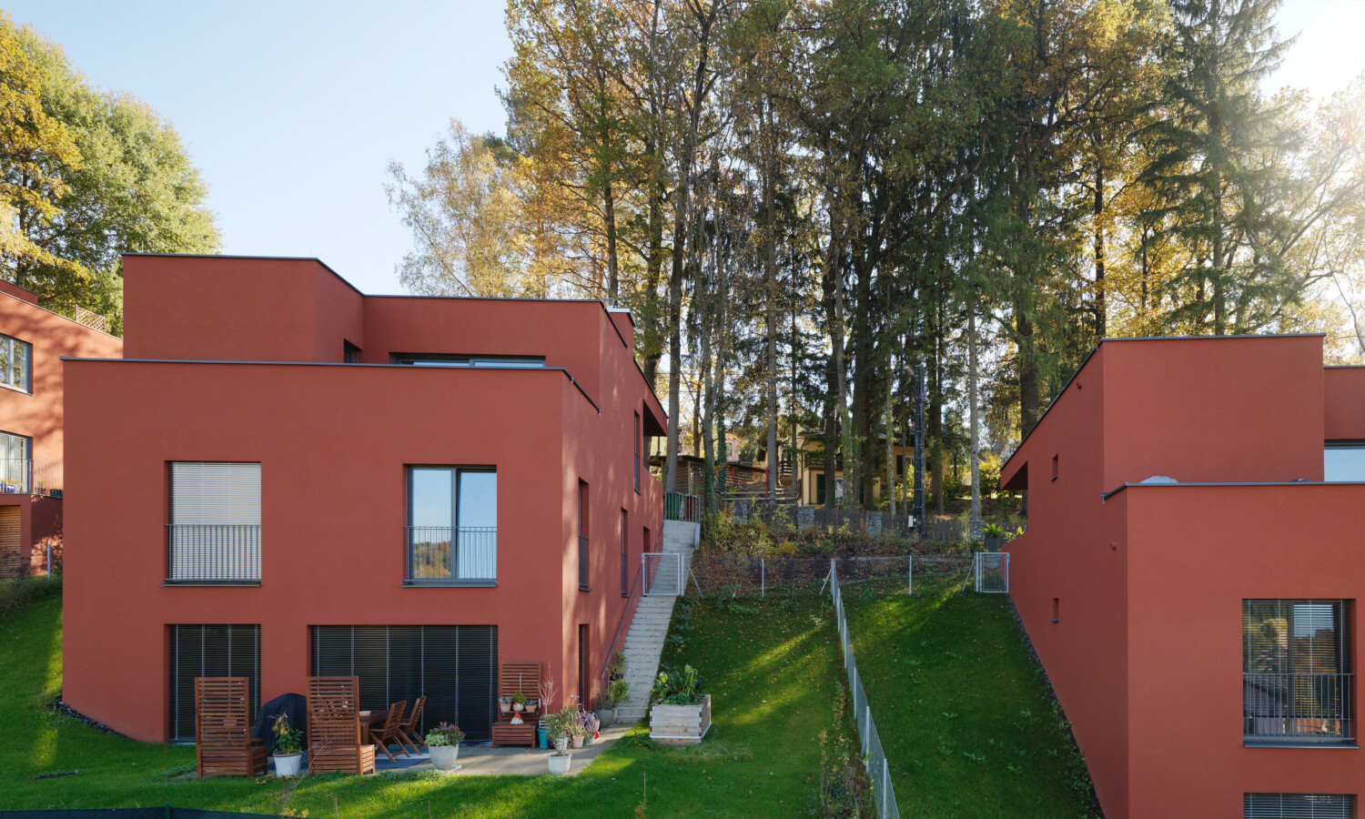 Durch die Hangneigung musste die Gesamtfläche als einzelne Baustelle behandelt werden. Gleichzeitig sollten natürlich alle Wünsche individuell erfüllt werden. Dass an vieles gedacht wurde, zeigt sich besonders schön in der gewählten Fassadenfarbe. Sie greift die Helligkeitswerte der umliegenden Bäume auf, die Gebäude fügen sich nahtlos in die natürliche Landschaft ein.