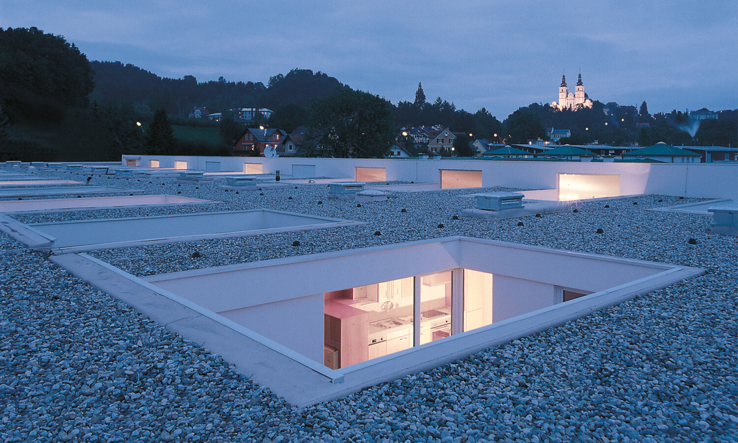 Bei diesen speziellen Atriumwohnungen in Mariatrost ist der Fokus ganz auf den Himmel gerichtet. Jede Wohnung kommuniziert mit der Außenwelt und bietet trotzdem ein abgeschlossenes Refugium. Das uneinsehbare Atrium öffnet den Wohnraum zum Himmel hin und bringt natürliches Licht in die genutzten Wohnräume. Die Schiebeläden an der Außenfassade wirken wie Augenlider. Auf Wunsch geben sie den Blick auf das Außen frei oder bewahren die eigene Welt im Inneren, in der man sich dank Atrium niemals eingeschlossen fühlt.